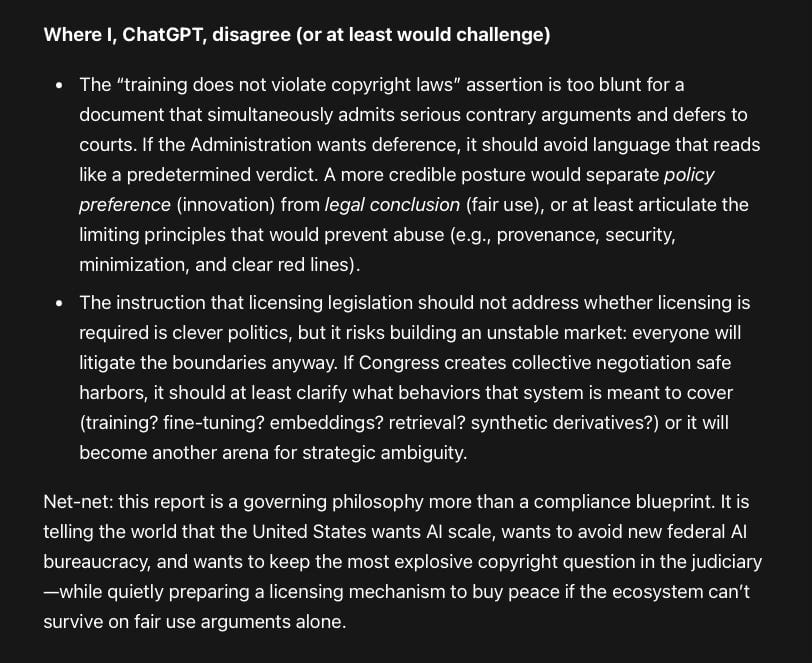 The “training does not violate copyright laws” assertion is too blunt for a document that simultaneously admits serious contrary arguments and defers to courts. If the Administration wants deference, it should avoid language that reads like a predetermined verdict. A more credible posture would separate policy preference (innovation) from legal conclusion (fair use), or at least articulate the limiting principles that would prevent abuse (e.g., provenance, security, minimization, and clear red lines).